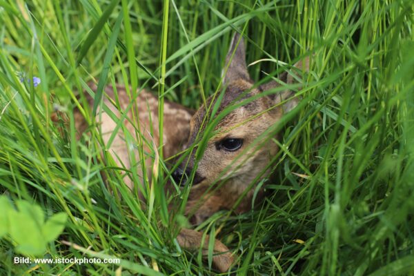 Gleichzeitig beginnt die Mähsaison. Moderne Mähwerke erfassen große Flächen in kurzer Zeit – Rehkitze haben keine Chance zu fliehen. Jährlich sterben tausende Jungtiere bei der Mahd.